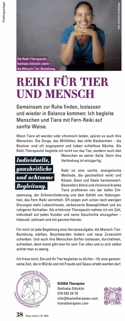 Im Regio Aktuell Magazin vom September 2025 ist eine Publireportage über mich und meine Arbeit erschienen. Es handelt sich um die grösste Zeitschrift der Nordwestschweiz mit einer Auflage von über 100’000 Exemplaren.
